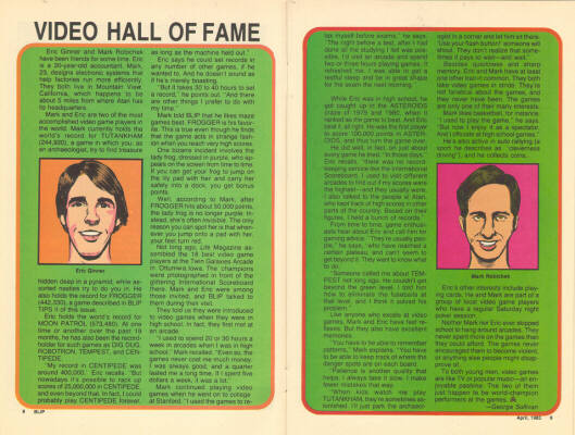 Mark and Eric are two of the most accomplished video game players in the world. Mark currently holds the world's record for TUTANKHAM (244, 920), a game in which you, as an archaeologist, try to find treasure hidden deep in a pyramid, while assorted nasties try to do you in. He also holds the record for FROGGER (442,330), a game described in BLIP TIPS II of this issue.